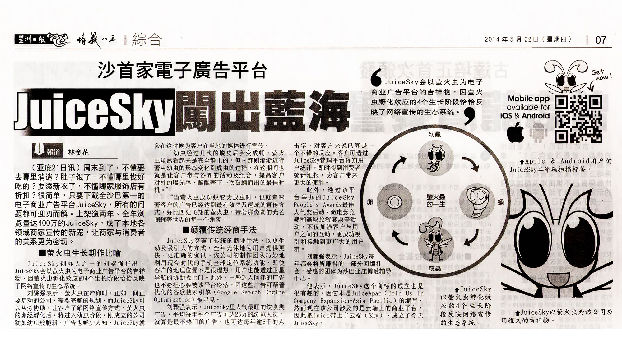 JuiceSky创办人之一的刘驟强指出,JuiceSky会以萤火虫为电子商业广告平台的吉祥物,因萤火虫孵化效应的4个生长阶段恰恰反映了网络宣传的生态系统.