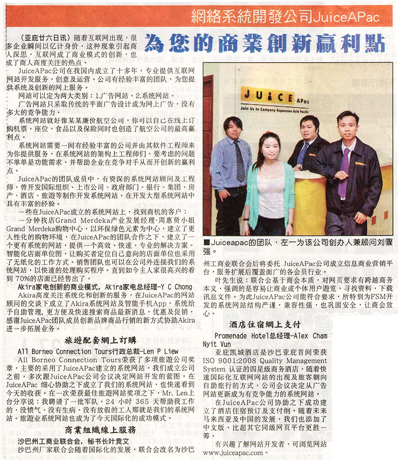 沙巴州廠家聯合會隨著國際化的發展,聯合會改名為沙巴州工商業聯合會後將委托 JuiceAPac公司成立信息商業營銷平台,服務擴展後覆蓋面廣的各會員行業。 葉先生說: 聯合會基於商會本質,對網頁要求有跨越商務本義,強調的是容易讓商業或個體用戶遊覽,尋找資料,下載訊息文件。為此JuiceAPac公司能符合要求,所特别为FSM開發的系統網站結構嚴謹,兼容性強,也鞏固安全,讓商會放心。