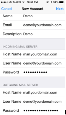 - On the right side change the Outgoing Mail Server: from mail.domain.com to mail.domain.com:xx (xx is your new assigned port).