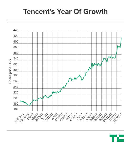 Entry to the half-a-trillion-dollar club — which includes Apple, Alphabet, Facebook, Microsoft and Amazon — comes a week after Tencent posted a profit of 18 billion RMB ($2.7 billion) on revenue of 65.2 billion RMB ($9.8 billion) for Q3 2017. Overall profit was up 69 percent year-on-year and revenue rose by 61 percent thanks to Tencent’s games business